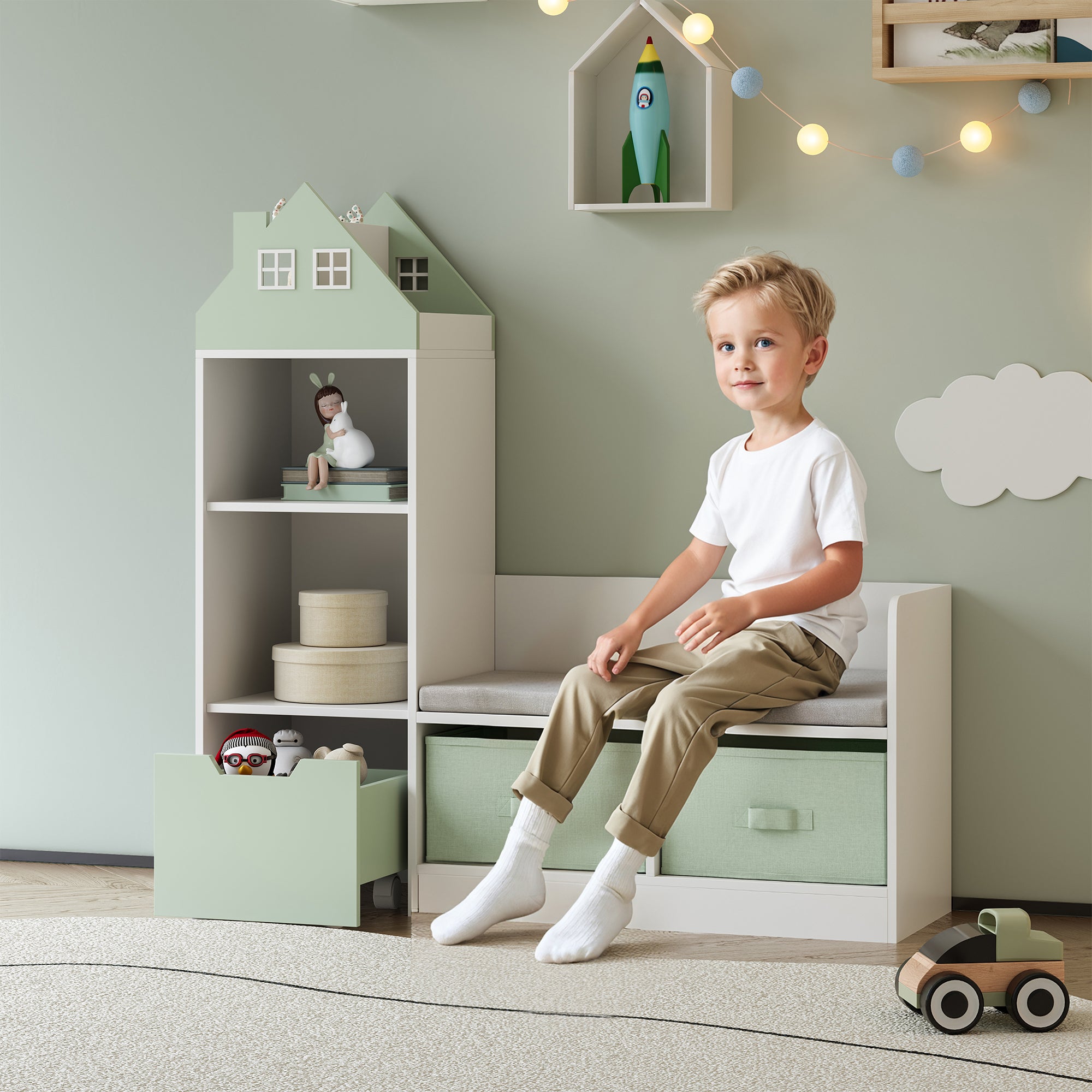 - Stijlvol en praktisch kinderregaal met geïntegreerde zitbank