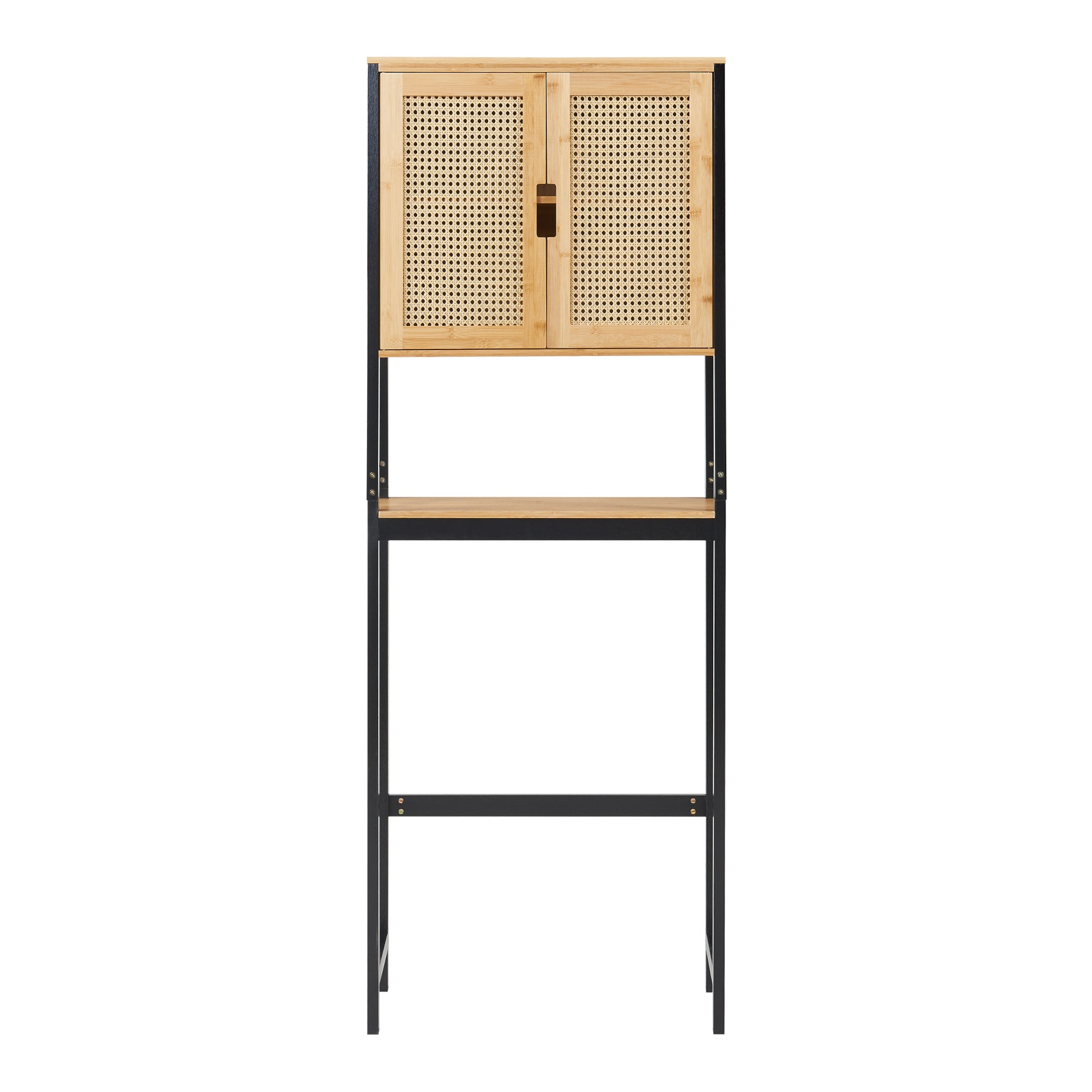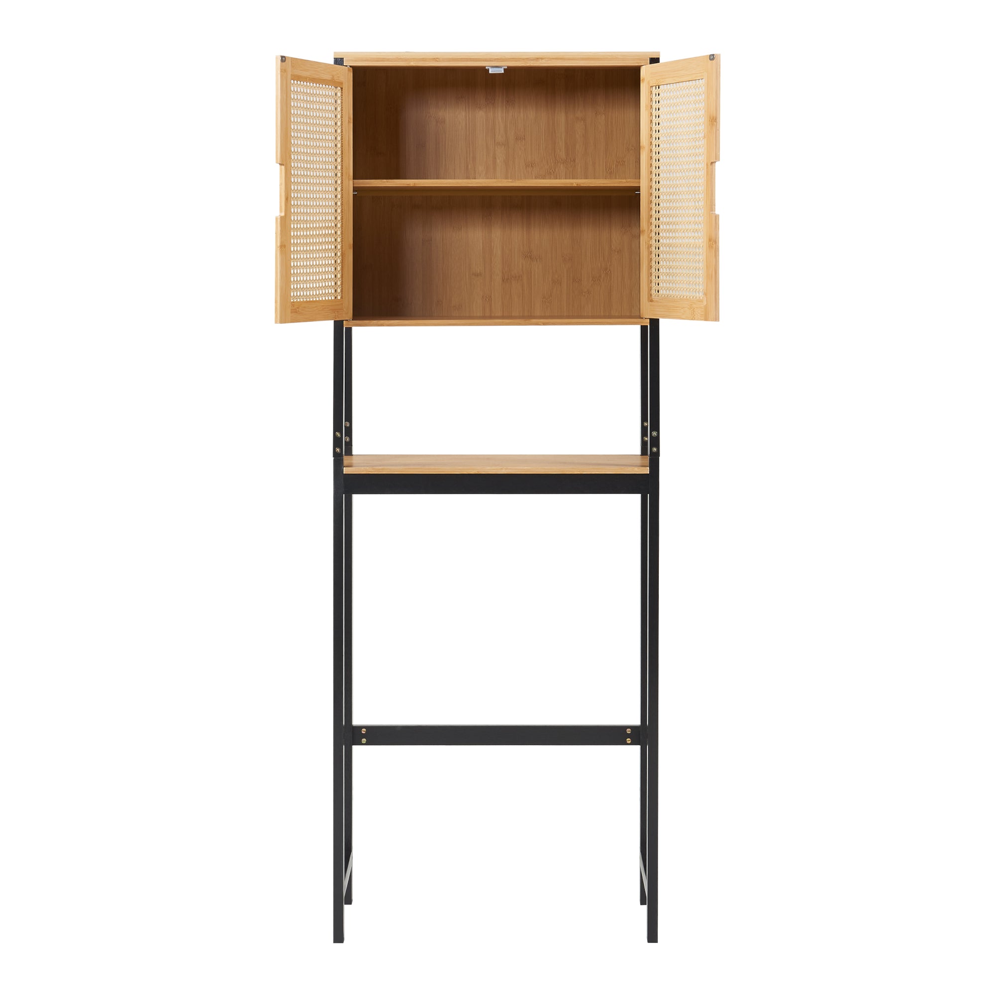 Deze stijlvolle badkamerkast biedt extra opbergruimte en een slimme organisatie, ideaal voor kleine badkamers. Dankzij de hoogte benut hij optimaal de ruimte boven het toilet en zorgt hij voor een opgeruimd geheel. Met twee deuren en een open opbergvak heb je eenvoudig toegang tot badkamerbenodigdheden, handdoeken of schoonmaakspullen. Een extra binnenplank biedt een praktische opbergplek voor cosmetica of een föhn. De montage is eenvoudig en alle benodigde materialen zijn inbegrepen. Een in 3 standen verstelbare dwarsstang zorgt voor stabiliteit en kan worden aangepast aan waterleidingen. Dankzij de open constructie is deze kast ook perfect te plaatsen boven een wasmachine of droger, waardoor je de beschikbare ruimte optimaal benut.